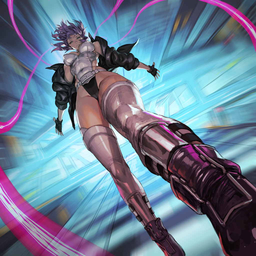 Returning to composition, I’m happy to be able to highlight the remnants of Loped’s construction alongside their choice of perspective and foreshortening. As a student of art, I really love that I can see the way Loped builds their mannequin shape by shape. Probably from their experience drawing fighting game characters, Loped is extremely good at simplifying and expressing muscle definition and has a fantastic sense of shape that they use for every part of their illustrations. Not only can you see some of the general simplified forms used to build Motoko’s body, cleverly foreshortened, you can clearly see the shapes in the shadows, light work and more obviously in the background. Probably needless to say, but since the proximity to the POV determines the complexity of detail, the choice to extend her left leg serves as a playground for tons of detail as well. Obviously in the shadow shapes used for the creases, but importantly also in the shapes of colored light, the gesture helps expand on the greater setting of the piece.